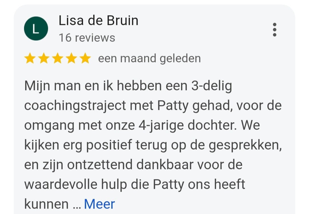 Patty heeft veel kennis en weet dat over te brengen op een toegankelijke manier. Ze heeft mij erg geholpen om op een andere manier naar het gedrag van mijn dochter te kijken en beter te kunnen begrijpen wat er speelt. Voor ons gezin waren dit de eerste belangrijke stappen.